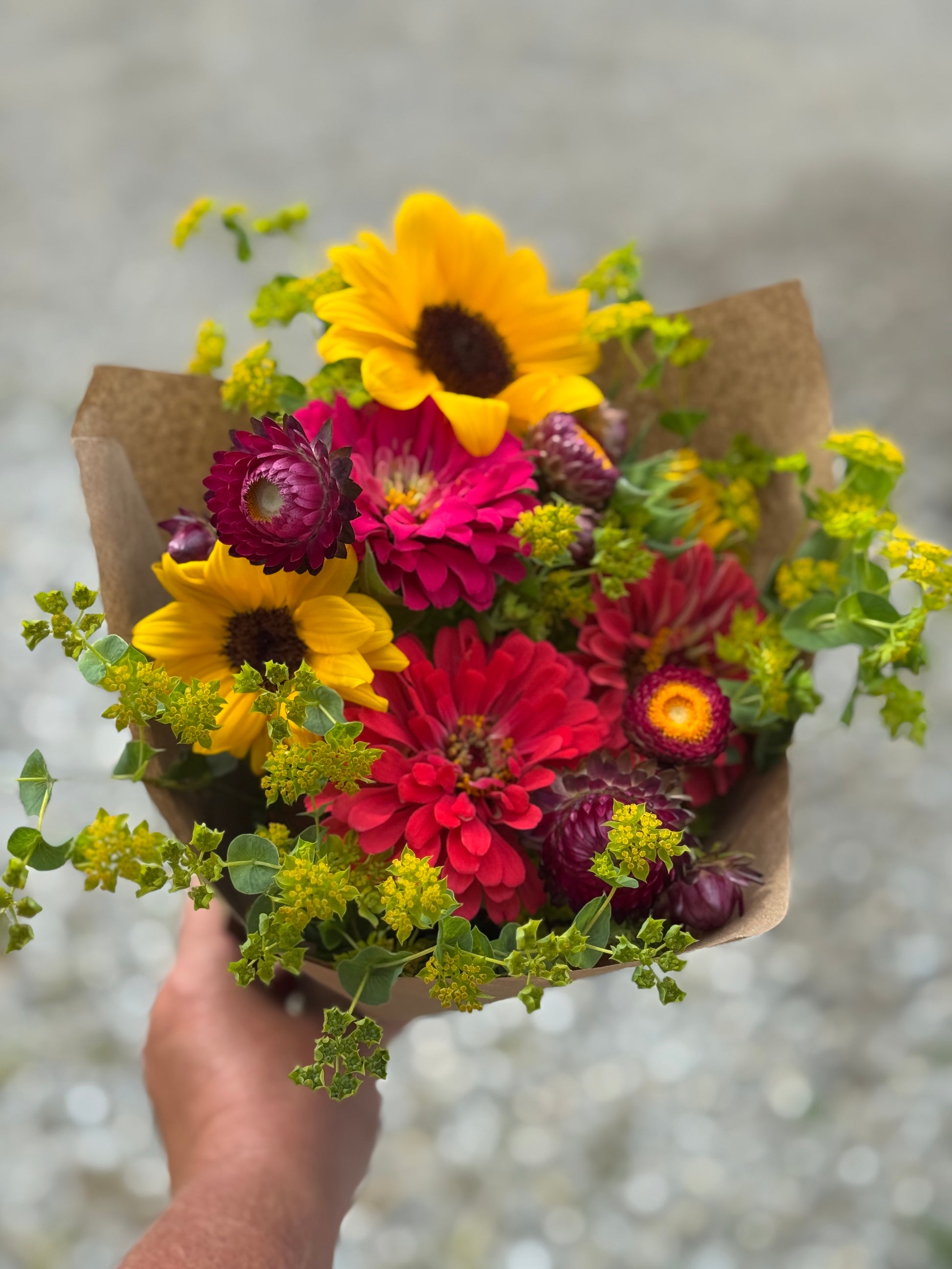 Mixed bouquet of locally grown seasonal flowers and foliage.